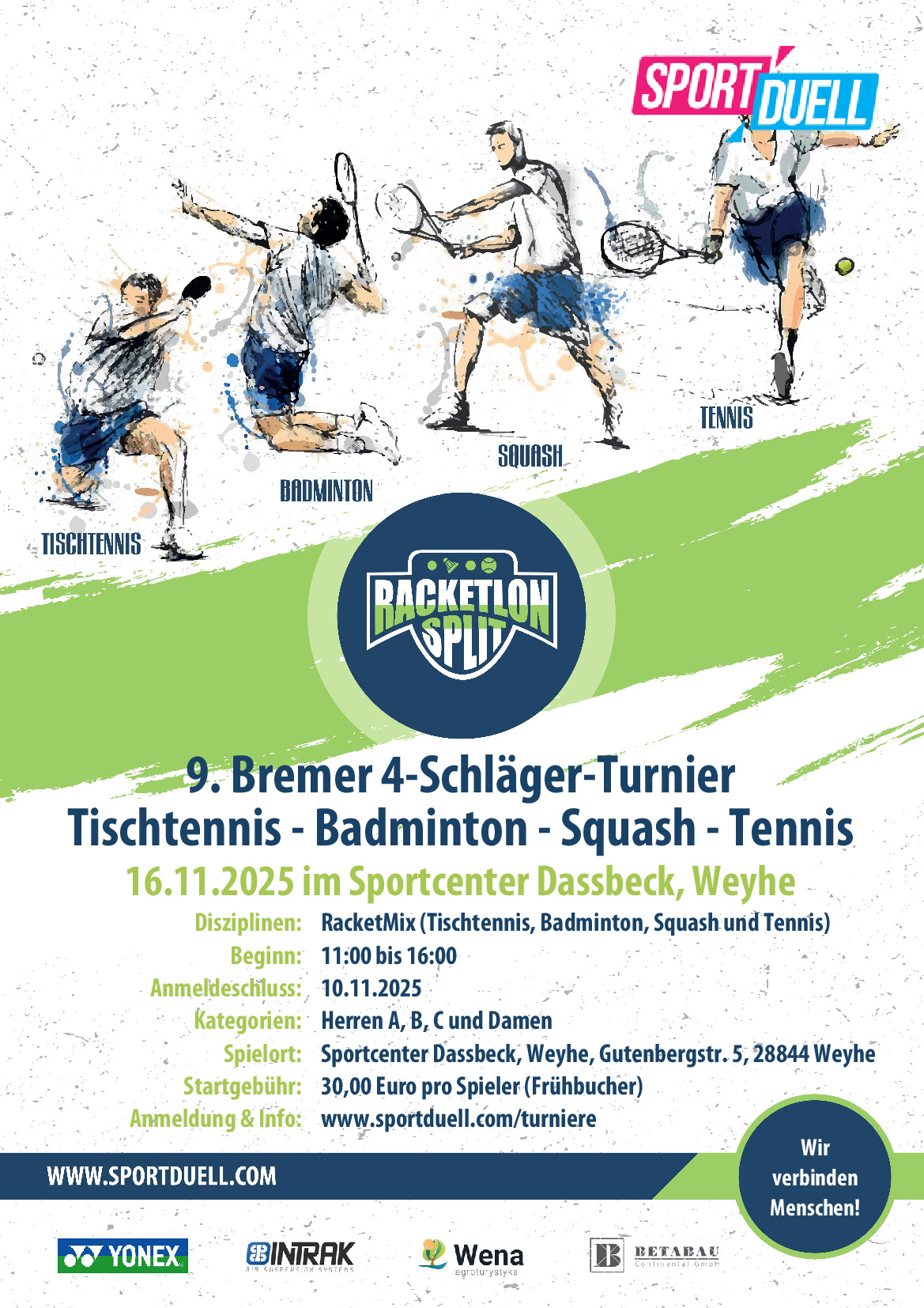- Vier Schläger (Tischtennis, Badminton, Squash und Tennis) Einzel Herren A, B, C, Damen